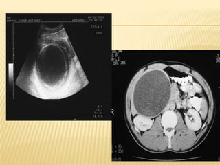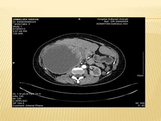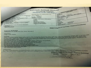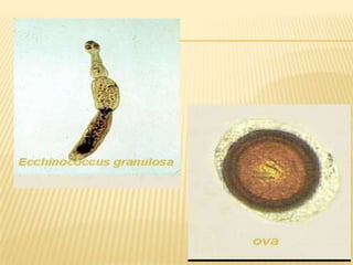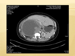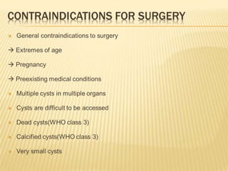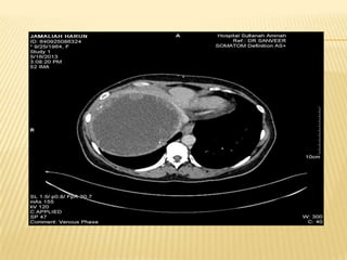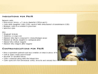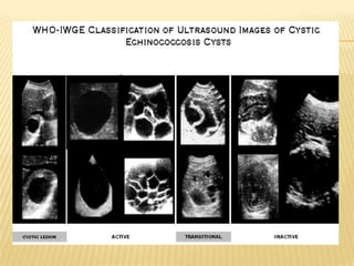 This case report describes a 49-year-old woman who presented with abdominal pain and weight loss. Imaging revealed a large cystic mass in her liver consistent with a hydatid cyst. She was treated with albendazole and referred for surgery. Hydatid disease is caused by the tapeworm Echinococcus and commonly involves the liver or lungs. Diagnosis involves history, imaging, and serology. Treatment options include medical therapy with albendazole or surgery to remove the cyst. Percutaneous aspiration, injection and re-aspiration (PAIR) is a minimally invasive alternative to surgery but has a higher risk of allergic reactions.
