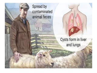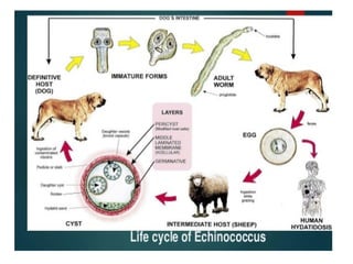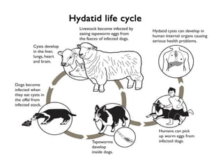 Hydatid disease is caused by the larval form of the Echinococcus tapeworm infecting intermediate hosts like sheep. It is prevalent in countries where sheep are raised and contact between dogs and livestock is common. The adult tapeworm lives in the small intestine of dogs which shed eggs through their feces. Humans can become infected by ingesting these eggs from contaminated food, water, or contact with dogs. The eggs hatch and develop into cysts most often in the liver and lungs. Surgical removal of cysts is the main treatment but carries risks if the cysts rupture during surgery. Prevention focuses on deworming dogs and preventing contact between dogs and slaughtered livestock to interrupt the parasite's lifecycle.