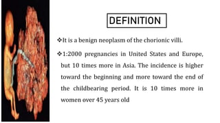 This document defines and describes hydatidiform mole, a benign tumor of the chorionic villi that can develop during early pregnancy. It discusses the two types of molar pregnancies - complete and partial mole - and their causes. Common symptoms include amenorrhea, vomiting, and vaginal bleeding. Diagnosis is typically made through an elevated hCG level in urine and ultrasound showing a snowstorm appearance. Surgical evacuation is the main treatment, with follow up to monitor hCG levels for potential choriocarcinoma development. Nursing care focuses on pain management, hygiene, emotional support, and monitoring for complications like hemorrhage and infection.