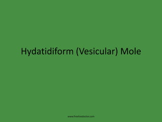 Hydatidiform mole is a benign tumor of the chorionic villi that can develop during early pregnancy. It occurs more frequently in Asia and in women over age 45. A complete mole contains no embryo and develops from fertilization of an empty ovum by one sperm, while a partial mole contains some fetal tissue and develops from double fertilization of one egg. Diagnosis is based on vaginal bleeding, elevated hCG levels, and ultrasound findings, while treatment involves surgical evacuation of the uterus. Patients require long-term follow-up to monitor for choriocarcinoma, a rare type of cancer that can develop after a molar pregnancy.