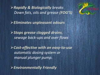 Hydra Grease-Eater is a biological enzyme liquid that rapidly breaks down fats, oils, and grease (FOG), effectively eliminating odors and preventing clogged drains. It features an easy-to-use automatic dosing system and is environmentally friendly, making it suitable for various commercial and domestic applications. Available in multiple pack sizes, the product offers cost-effective solutions for maintaining grease traps and sewage systems.