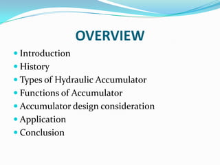 The document provides a comprehensive overview of hydraulic accumulators, including their history, types, functions, and design considerations. It explains various types of accumulators (e.g., tower, compressed gas, diaphragm) and their applications, such as energy storage, shock absorption, and leakage compensation. Additionally, it highlights the benefits of using accumulators, including reduced costs, improved performance, and lower noise levels.
