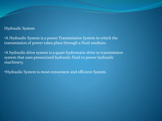 This document discusses hydraulics and pneumatics systems. It describes the key components of hydraulic systems, including prime movers, pumps, control valves, actuators, fluid, filters, and accumulators. Common applications are also listed. For pneumatic systems, it defines pneumatics as using compressed air and pressure differentials to create movement similar to hydraulics. The major parts of a pneumatic system are identified as the compressor, storage tanks, regulators, gauges, valves/solenoids, actuators, fittings and tubing. Specific pneumatic components like compressors, tanks, regulators, valves, actuators and their functions are then described in more detail.