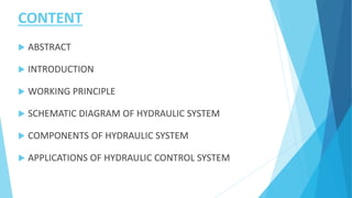 This document describes a hydraulic control system and its components. It discusses how hydraulic systems work using Pascal's law and fluid power. The key components of a hydraulic system are described as the prime mover, pump, control valves, actuators, fluid, filters and protective devices. Examples are provided of different types of pumps, control valves, actuators and applications of hydraulic systems in industries like manufacturing and construction.