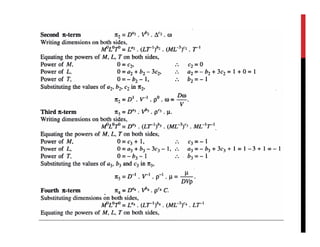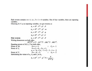 The document discusses dimensional analysis, similitude, and model analysis. It provides background on how dimensional analysis and model testing are used to study fluid mechanics problems. Dimensional analysis uses the dimensions of physical quantities to determine which parameters influence a phenomenon. Model testing in a laboratory allows measurements to be applied to larger scale systems using similitude. Buckingham's π-theorem is introduced as a way to non-dimensionalize variables when there are more variables than fundamental dimensions. Rayleigh's and Buckingham's methods are demonstrated on an example of determining the resisting force on an aircraft.