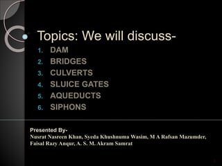 The document is a presentation on hydraulic structures, covering key topics such as dams, bridges, culverts, sluice gates, aqueducts, and siphons. It defines each structure, explaining their functions, importance, and basic operating principles, while also highlighting notable examples. The presentation emphasizes the role of these structures in water management, electricity generation, and infrastructure support.