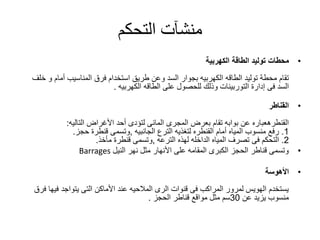 يتناول الوثيقة أعمال التحكم في المنشآت المائية، بما في ذلك محطات توليد الطاقة الكهربائية والقناطر والهدارات. يشرح أيضًا دور السدود والهدارات في قياس وتصريف المياه وكيفية تشغيل المصبات وأنواعها. بالإضافة إلى ذلك، يتطرق إلى منشآت التقاطع مثل الكبارى والعبارات والسحارات.