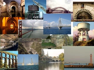 The document describes various hydraulic structures including cisterns, arabic baths, sewers, aqueducts, water wheels, water mills, water tanks, dikes, bridges, docks, dikes, ports, dams, and locks. These structures are used for storing water, transporting water, obtaining energy from water flow, crossing rivers, harboring boats, preventing erosion, and controlling water levels. They are typically constructed using materials like stone, timber, concrete, and steel and have architectural features such as arches, triangular shapes, post-and-beam systems, and massive constructions.