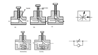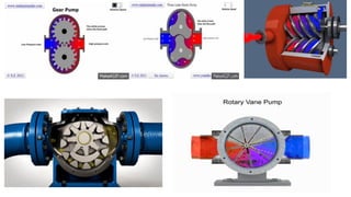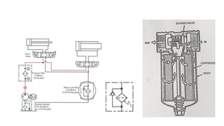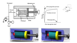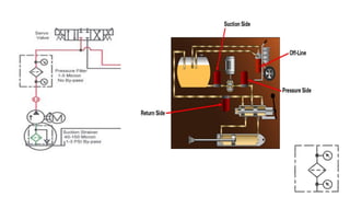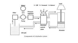 The document discusses hydraulic systems and their components. It begins with an introduction to hydraulic systems and then describes the main components, including reservoirs, filters, control valves, pumps, accumulators, and actuators. It explains that reservoirs store hydraulic fluid and help remove contamination with features like baffle plates and air breathers. Filters, including suction strainers and pressure line filters, work to remove particles from the fluid and protect components. Control valves direct flow and pressure. Pumps and accumulators work with valves to power hydraulic circuits. Actuators, such as cylinders and motors, provide the mechanical output of hydraulic systems.