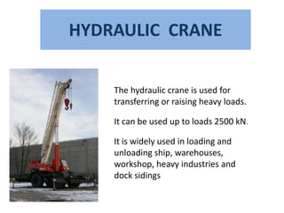 1. Hydraulic cranes use pressurized water to lift heavy loads up to 2500 kN through fixed cylinders and sliding rams connected to pulley blocks.