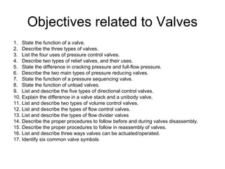 The document discusses objectives related to hydraulic valves. It covers the functions of different types of valves including pressure, directional, and volume/flow control valves. Some key points include that pressure control valves are used to limit, reduce, or set system pressures. Relief valves come in direct acting and pilot operated types. Pressure reducing valves include constant reduced and fixed amount types. Directional control valves include check valves, rotary valves, poppet valves, electro-hydraulic valves, and spool valves. Valves can be actuated mechanically, with pilots, or electrically.