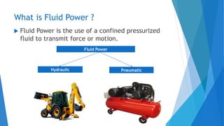 Hydraulics uses pressurized fluids to transmit and control force in a system. It operates based on Pascal's law where pressure is transmitted equally in all directions throughout an enclosed fluid. A basic hydraulic system includes a pump, reservoir, filter, control valve, actuator and return line. Hydraulics is commonly used in heavy equipment, manufacturing and aircraft due to its ability to produce high pressures and precisely control movements. Common components include gear pumps, cylinders, directional control valves and accumulators. Hydraulic systems are visualized through circuit diagrams and simulations.