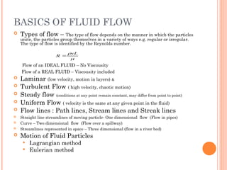 The document covers the fundamentals of fluid flow, including types of flow such as laminar and turbulent, as well as the principles of the Reynolds number and Bernoulli's equation. It discusses open channel flow and provides examples of practical applications and calculations related to fluid movement through various pipe systems and channels. Additionally, the text addresses hydraulic jumps and critical flow conditions, along with relevant equations and problems for further understanding.