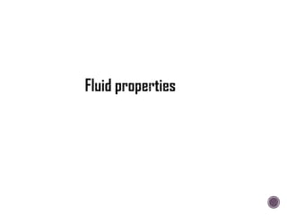 The document discusses the fundamental concepts of fluid mechanics, including the definitions and properties of fluids, including density, viscosity, and surface tension. It outlines the branches of fluid mechanics, specifically hydraulics, and describes the applications and significance of these properties in engineering, such as fluid flow, pressure variation, and hydrostatics. Key equations and principles like Pascal's Law and the relationship between shear stress and viscosity are also covered.
