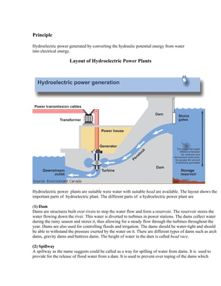 Hydroelectric power plants site selection involves two main stages: (1) Preliminary investigations to assess feasibility and choose between alternatives, allowing preliminary designs and cost estimates to be prepared; and (2) Final investigations of the recommended site for detailed exploration to establish suitability and enable final designs. Key components of hydroelectric power plants include dams to form reservoirs, spillways to release flood waters, penstocks or tunnels to carry water from reservoirs to turbines, surge tanks to regulate water pressure, and power stations containing turbines coupled to generators to convert the kinetic energy of flowing water into electricity. Advantages include low operating costs and no greenhouse gas emissions during power generation, while disadvantages can include environmental disruption and the need to relocate communities.