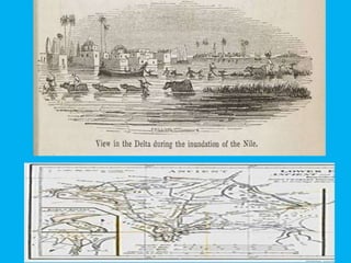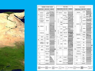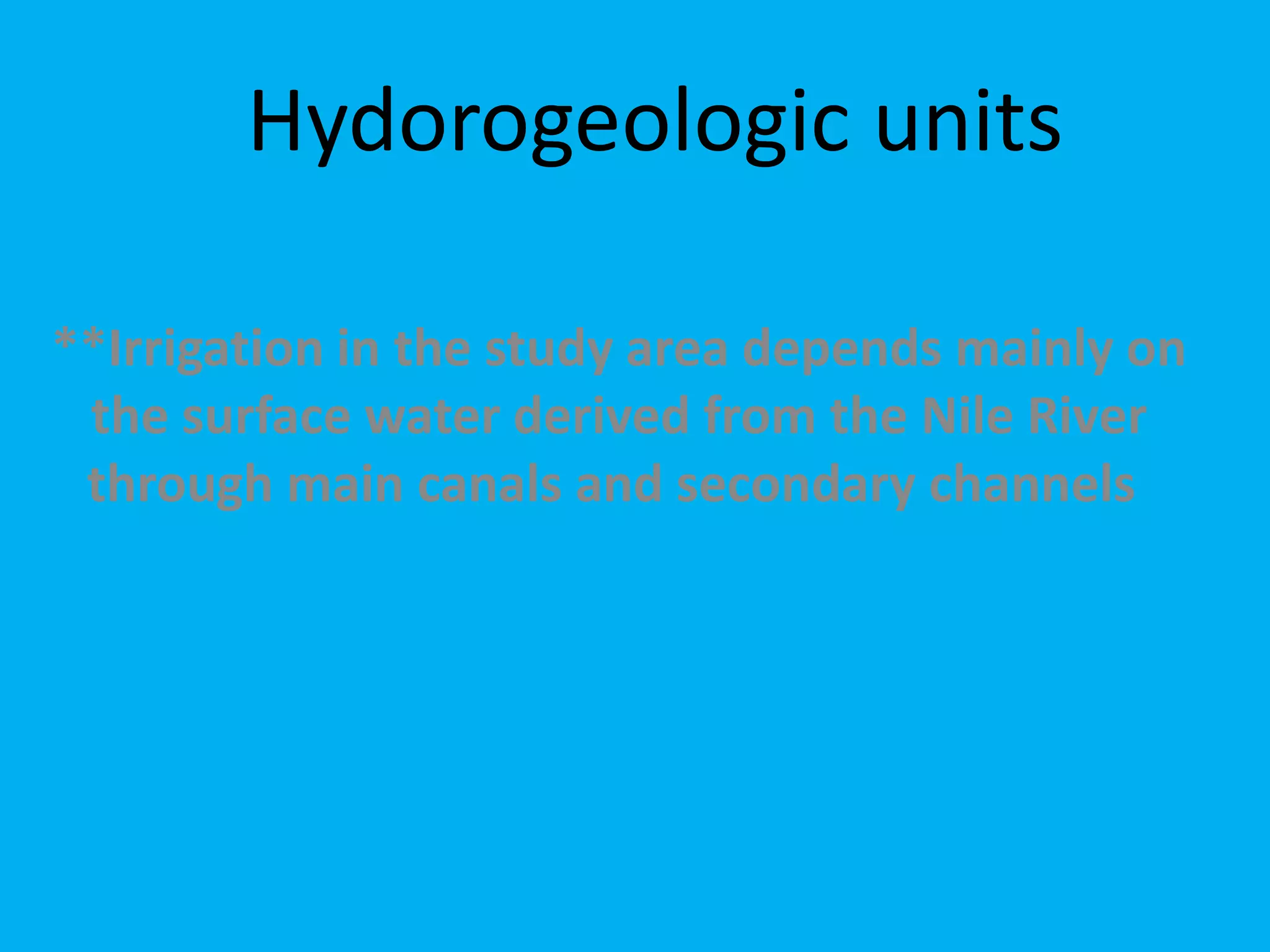 The document summarizes several hydrogeologic units in the Nile Delta region of Egypt. It describes the key aquifers that supply irrigation and groundwater in the area, including the Nile Delta Quaternary aquifer, Oligocene Aquifer, Moghra (Miocene) Aquifer, and Wadi El Natrun (Pliocene) Aquifer. It notes the thickness, composition, recharge sources, and flow direction of each aquifer. The quality of groundwater is also noted to be affected by sea level rise and human activities.