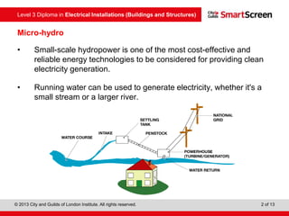 This document discusses micro-hydroelectric power systems. It explains that small-scale hydropower can provide clean electricity generation for homes using flowing water from streams or rivers. The key components of a micro-hydro system are described, including an intake, penstock, turbine, generator, and tailrace. Equations are provided to calculate the mechanical and electrical power output based on factors like flow rate, head, and system efficiencies. Advantages are reliable renewable energy without emissions, while disadvantages include high initial costs and limited expansion options.