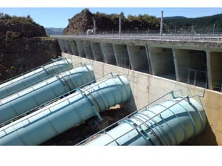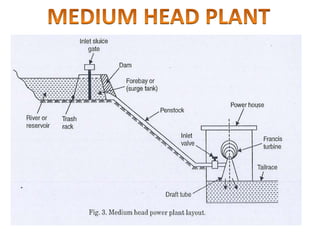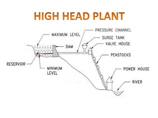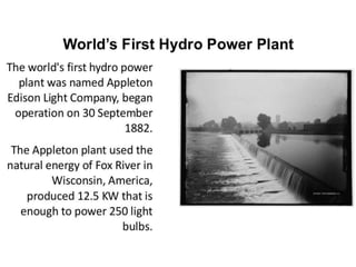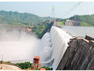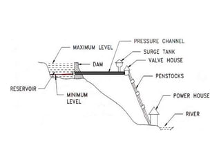 This document provides information on hydro power stations, including their schematic arrangement, classification, advantages and disadvantages, site selection criteria, and environmental impacts. It discusses the key components of a hydro power plant such as the catchment area, dam, reservoir, penstocks, valves, turbines, generators, and draft tubes. It also lists the largest hydro power producers in the world and provides examples of major hydro power projects in India along with career opportunities in the hydro power sector.