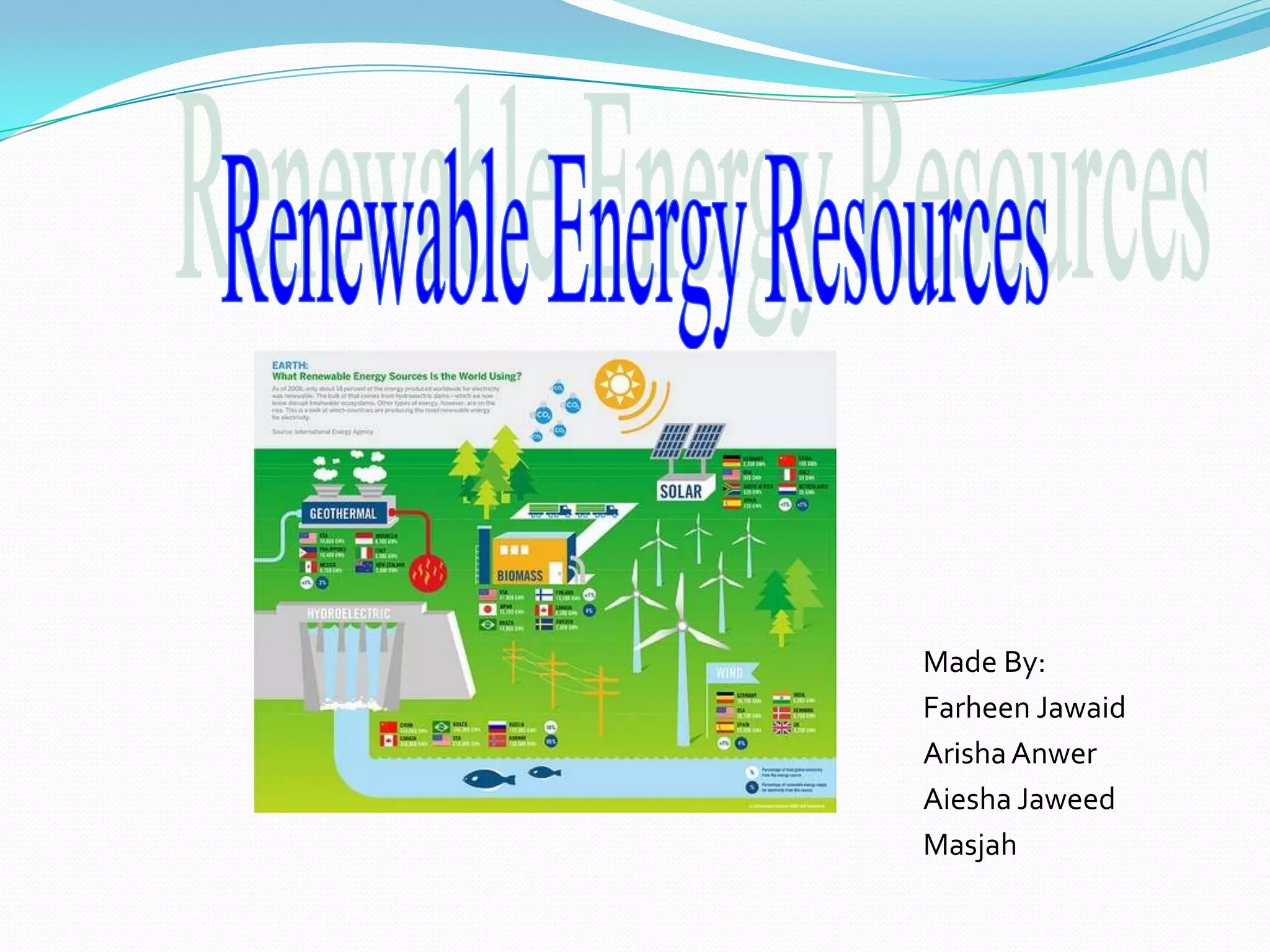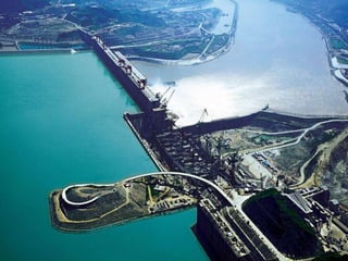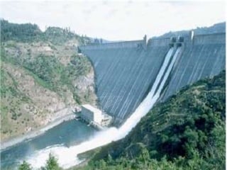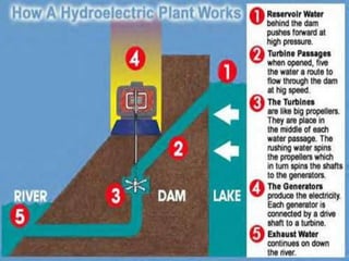 This document discusses renewable energy and hydropower. It defines renewable energy as energy from natural resources like sunlight, wind, rain, tides and geothermal heat. Hydropower is generated from water flow and is captured using dams, turbines and generators. Large hydropower dams can power cities but require large initial investments, and have social costs from relocating residents and environmental impacts from flooding land. Smaller run-of-river hydropower projects have fewer impacts. Hydropower is a significant renewable source that produces clean energy without pollution.