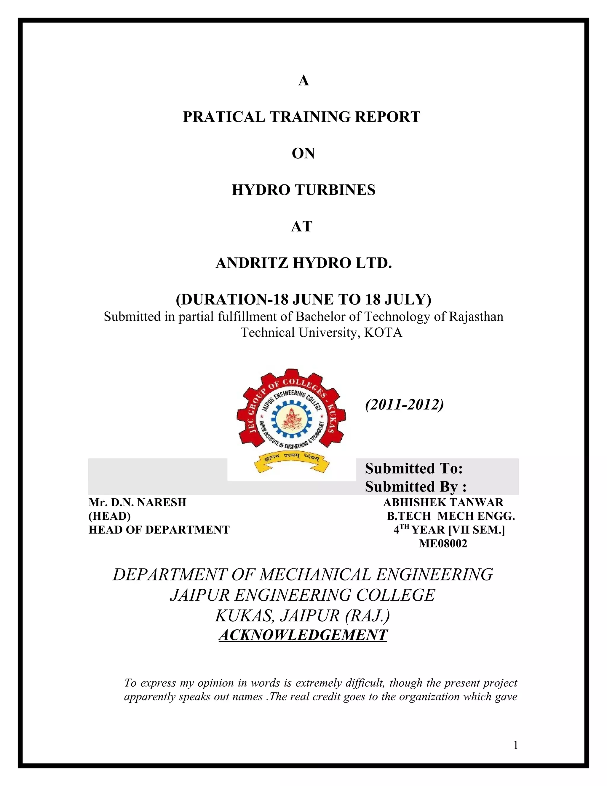 The document provides details about the student's practical training report on hydro turbines at Andritz Hydro Ltd. It includes an introduction, acknowledgments, preface, table of contents, and initial chapters on the company profile and history of Andritz as well as an introduction to hydro turbines. The introduction to hydro turbines classifies turbines as either impulse or reaction turbines and further classifies them based on direction of water flow, available head and discharge, speed, and shaft disposition. It also provides details on the main assemblies and operation of Pelton turbines.