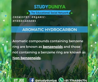 The document discusses aromatic hydrocarbons, distinguishing between benzenoids and non-benzenoids, and explains the structure and characteristics of benzene, including its planarity and electron delocalization. It also covers methods for the preparation of benzene, including decarboxylation of aromatic acids and reduction of phenol, as well as various electrophilic substitution reactions such as nitration, halogenation, and Friedel-Crafts reactions. Additionally, it mentions directing effects of different substituents on electrophilic aromatic substitution reactions.