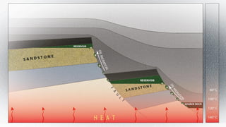 Migration of petroleum involves transporting hydrocarbons from the source rock to accumulation points within reservoirs, divided into three stages: primary, secondary, and tertiary migration. Primary migration allows hydrocarbons to move within source rocks to permeable carrier beds, influenced by expulsion models like saturation, pressure-driven, and chemical diffusion. Secondary migration involves hydrocarbons moving within carrier beds towards accumulations, whereas tertiary migration refers to the remobilization from existing accumulations, potentially altering volumes and fluid characteristics.