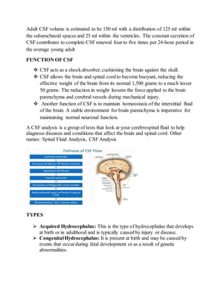Hydrocephalus is a condition where excess cerebrospinal fluid accumulates in the brain, causing increased intracranial pressure. It results from an imbalance between the production and absorption of cerebrospinal fluid, which normally circulates around the brain and spinal cord. The main symptoms of hydrocephalus vary depending on age, but include headache, nausea, gait issues, and cognitive decline. It is typically diagnosed through brain imaging scans and spinal taps. The standard treatment is surgically placing a shunt to drain fluid from the brain to other parts of the body, though endoscopic procedures to create openings in the brain ventricles are also used. Complications can include shunt malfunctions requiring additional surgeries