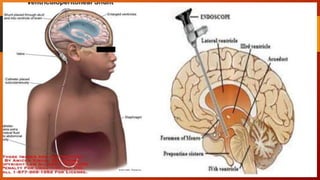 Hydrocephalus is an excessive accumulation of cerebrospinal fluid (CSF) within the ventricles of the brain that results in enlarged ventricles and increased intracranial pressure. It can be caused by obstruction of CSF flow, overproduction of CSF, or impaired absorption of CSF. Common symptoms include an enlarged head size, vomiting, and headaches. Treatment options include the use of shunts to divert CSF from the brain to the abdominal cavity or endoscopic procedures. Prognosis depends on severity but can include long-term neurological and developmental issues if not treated effectively.