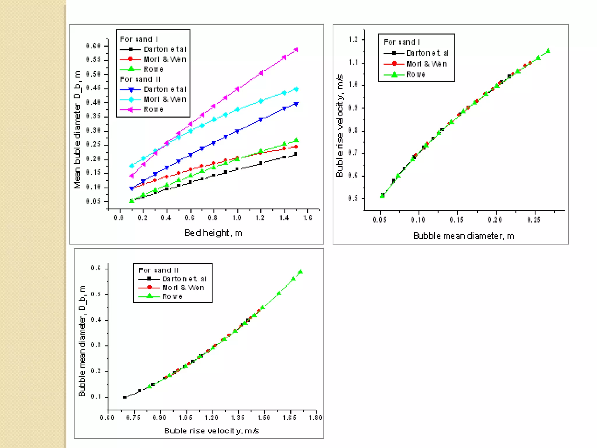 2) Parameters measured included Umf, Ut, and bubble behavior for two types of sand (Sand I and Sand II) used as bed material. Theoretical predictions of Umf and Ut using established equations were also compared to experimental values.