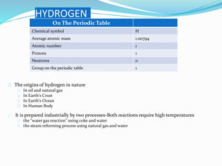 The document discusses hydrogen, including its discovery, naming, properties, location in nature, industrial production processes, compounds it can form like water and acids, and common uses such as in fuel cells, welding, and rocket fuel. Hydrogen is the most abundant element in the universe and is used widely in industry for refining, treating metals, and processing foods.