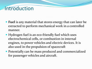 Hydrogen is the most abundant element in the universe but does not exist naturally on Earth. It has potential as a clean fuel for vehicles and devices. Currently it is mainly produced from methane, but can also be generated through electrolysis and other methods. Hydrogen is colorless, odorless and highly flammable. It can power vehicles and devices through combustion or in fuel cells, which generate electricity through electrochemical reactions with oxygen and have higher efficiency than combustion engines. Widespread use of hydrogen faces challenges including lack of infrastructure and need for cost reductions in production and fuel cells.