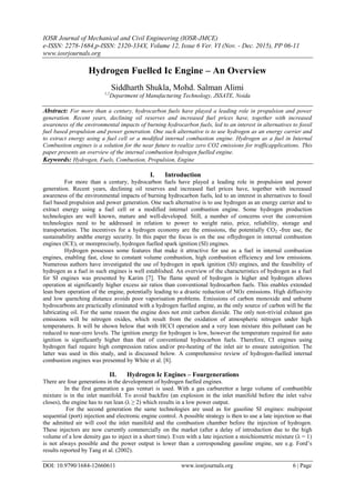 This document provides an overview of hydrogen-fueled internal combustion engines (ICE), discussing the potential of hydrogen as an alternative to hydrocarbon fuels due to its low emissions and efficiency advantages. It details the four generations of hydrogen ICE development, various operational strategies, and challenges related to combustion stability and engine design. The paper emphasizes the benefits of hydrogen in achieving near-zero CO2 emissions and highlights technological advancements necessary for optimizing hydrogen use in ICEs.