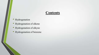 The document discusses the process of hydrogenation, a chemical reaction involving the addition of hydrogen to organic compounds, typically facilitated by catalysts like nickel, palladium, or platinum. It details the hydrogenation of alkenes, alkynes, and benzene, explaining mechanisms and conditions under which these reactions occur, while emphasizing the exothermic nature of the process and the importance of stopping reactions at specific stages to prevent over-hydrogenation. Overall, the document outlines the fundamentals and applications of hydrogenation in organic chemistry.