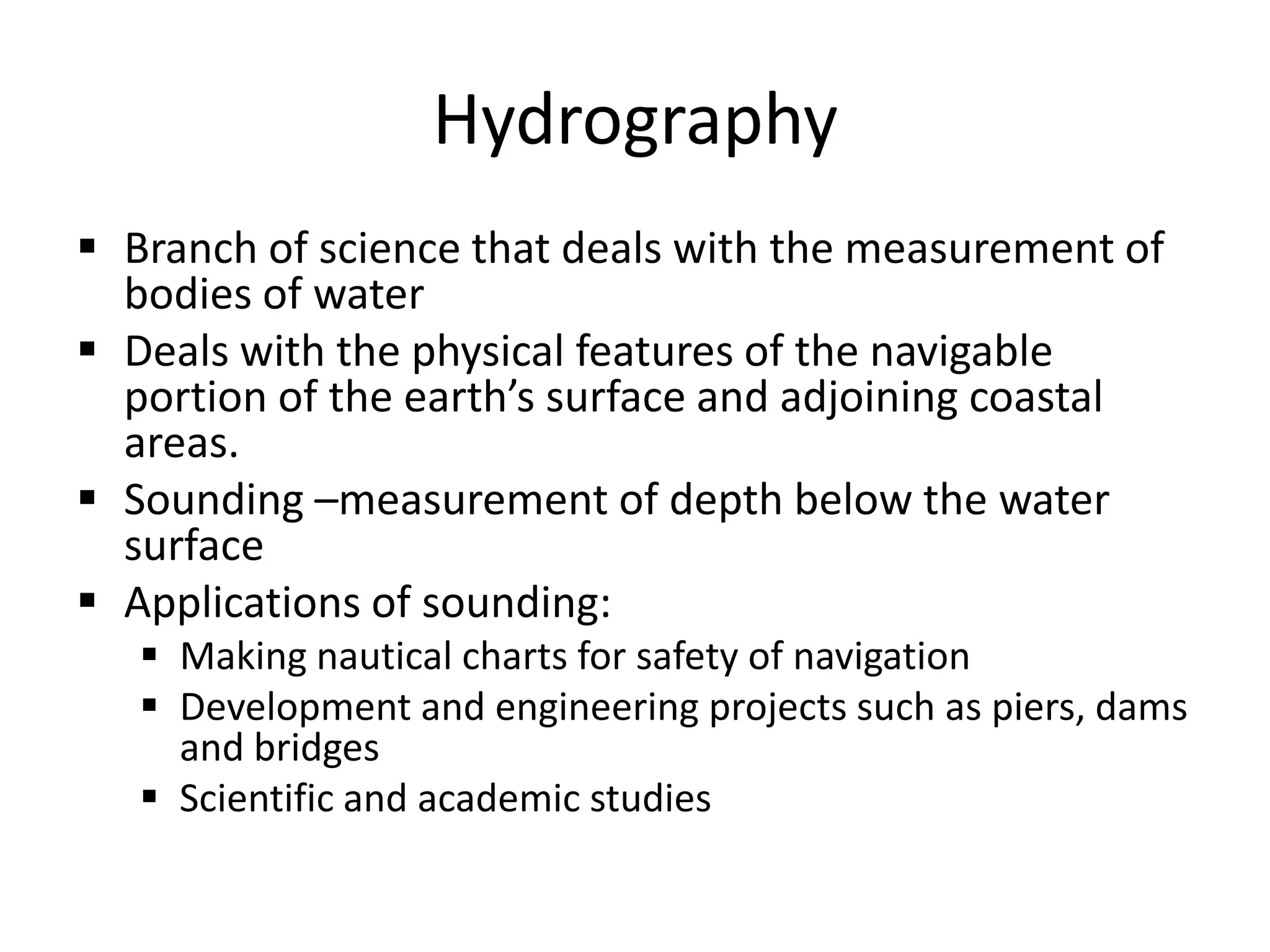 This document summarizes key aspects of hydrographic surveying. It discusses measuring water depths through sounding, establishing horizontal and vertical controls, surveying shorelines, instruments used for sounding like sounding poles and echo sounders, reduction of soundings to a datum, teams involved in surveys, cartography methods to prepare nautical charts, key elements of nautical charts including datums and symbols, and common terms used in hydrography.