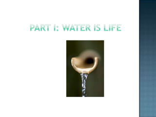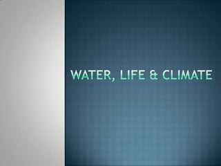 Water is essential for life and the hydrologic cycle distributes it around the planet. The cycle involves evaporation, transpiration, condensation, precipitation, collection as runoff or infiltration into groundwater, and storage in oceans, glaciers, and ice caps. Climate is influenced by the hydrologic cycle as warm air holds more water vapor and rising air cools, causing precipitation. Changes to the cycle, such as intensification due to climate change, can produce more extreme flooding and drought.