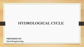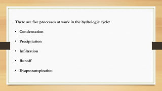 The hydrological cycle involves five key processes: condensation, precipitation, infiltration, runoff, and evapotranspiration, where water vapor condenses to form clouds and eventually returns to the Earth's surface as precipitation. This cycle begins with evaporation from oceans, with moisture being transported globally and affecting various geographic factors. Infiltration allows water to enter the soil, while runoff consists of surface and subsurface water that flows into bodies of water.