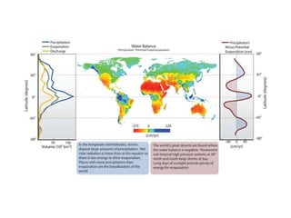 - Weather patterns result in different biomes and rainfall patterns across geographic regions.