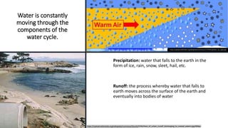 Water is constantly moving through the water cycle on Earth. It falls as precipitation, runs across the surface as runoff, collects in surface water bodies or infiltrates underground as groundwater. Water evaporates from plant leaves, soil, and surface water before condensing in the atmosphere and falling again as precipitation, continuing the cycle. Most water on Earth is salty ocean water, while freshwater is found in the atmosphere, on land and underground. Humans rely on and impact the water cycle through activities like agriculture, industry, and domestic use. Conservation efforts can help reduce human water usage.