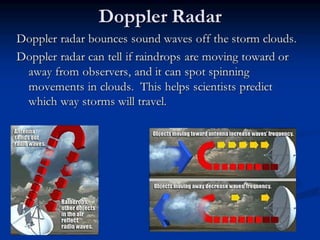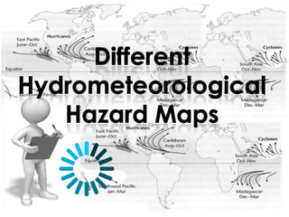 This document discusses various hydrometeorological hazards such as tropical cyclones, thunderstorms, floods, droughts, and more. It provides definitions and descriptions of different types of hazards like tropical cyclones, typhoons, hurricanes, thunderstorms, tornadoes, flash floods, floods, storm surges, El Niño and La Niña. The document also discusses how different hazards are monitored and forecasted using tools like satellites, Doppler radar, and preparedness and mitigation strategies to adopt before, during, and after hazards occur.