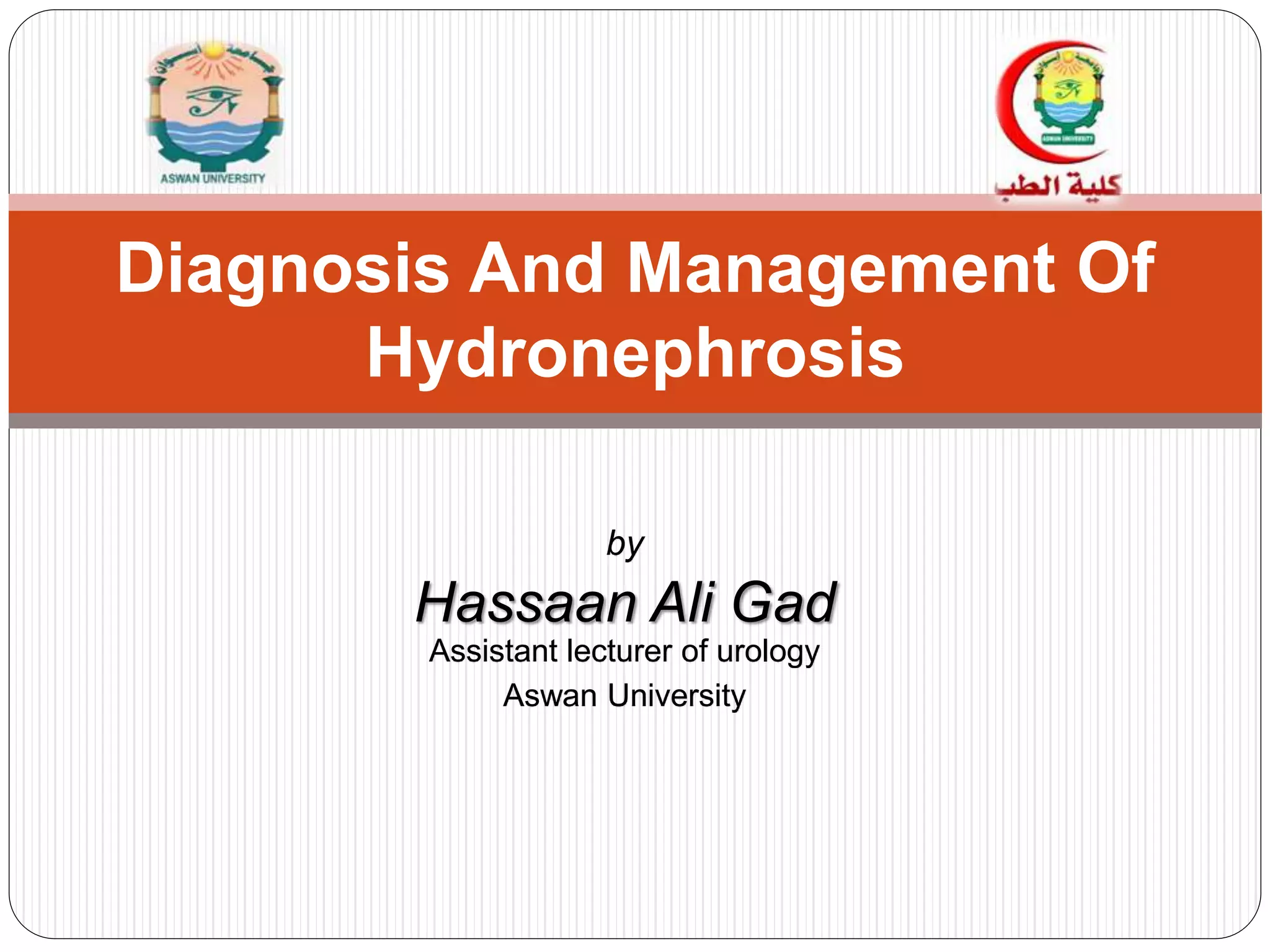 The document provides a comprehensive overview of hydronephrosis, detailing its definition as progressive dilation of the pelvi-calyceal system due to upper urinary tract issues. It discusses etiology, including obstructive and reflux causes, along with clinical features, investigation methods, and treatment options based on the severity and type of hydronephrosis. Treatment approaches vary for unilateral and bilateral cases, considering factors such as kidney function and patient condition.