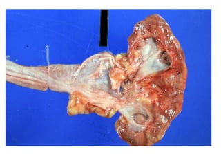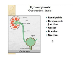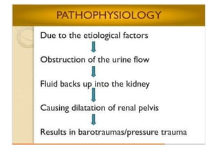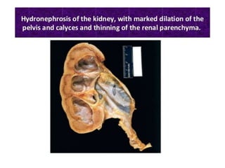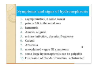 Hydronephrosis is the dilatation of the renal pelvis or calyces, which can be associated with obstruction. It has various causes including extramural obstruction from aberrant vessels or tumors, intramural obstruction from congenital issues or tumors, and intraluminal obstruction from stones or papillary necrosis. Bilateral hydronephrosis can result from urethral obstruction or issues affecting both kidneys. Imaging studies are used to diagnose and characterize hydronephrosis. Long term obstruction can lead to thinning of the renal parenchyma and loss of kidney function.