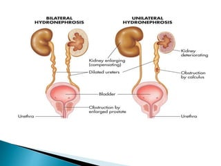 Hydronephrosis is a condition where one or both kidneys become swollen due to a blockage in the urinary system. It can be caused by a blockage in the ureters or bladder backing up urine into the kidneys. Symptoms may include flank pain, hematuria, urinary infections, or the condition may be asymptomatic. Diagnosis involves history, physical exam, ultrasound to visualize the kidneys and ureters, IVU to assess the location of blockage, and CT scan to detect stones. Treatment focuses on removing the obstruction, draining excess urine, and antibiotics to prevent infection.