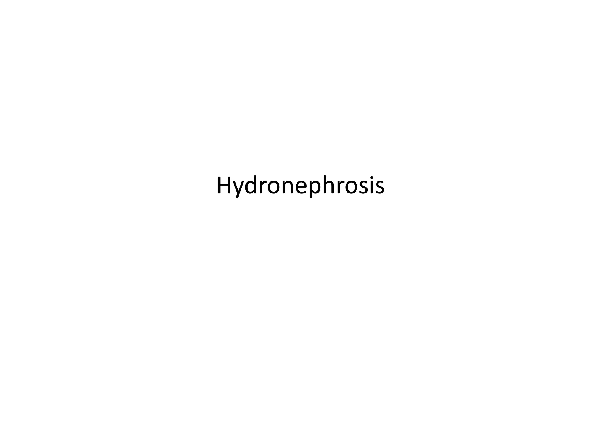 Hydronephrosis is the dilatation of the renal pelvis and calyces caused by partial obstruction of urine flow. It can be caused by primary/idiopathic factors or secondary to extramural, intramural, or intraluminal issues. Clinically, it presents as renal swelling and features of the underlying cause. Investigations include imaging like ultrasound, CT, MRI. Treatment depends on the cause but may involve pyeloplasty surgery to repair the pelviureteric junction or nephrectomy in severe cases.