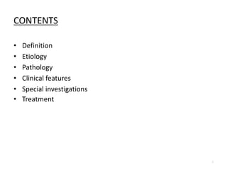 Hydronephrosis is the dilatation of the renal pelvis and calyces caused by partial obstruction of urine flow. It can be caused by primary/idiopathic factors or secondary to extramural, intramural, or intraluminal issues. Clinically, it presents as renal swelling and features of the underlying cause. Investigations include imaging like ultrasound, CT, MRI. Treatment depends on the cause but may involve pyeloplasty surgery to repair the pelviureteric junction or nephrectomy in severe cases.