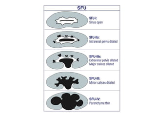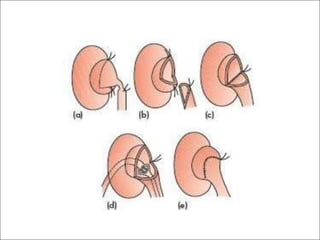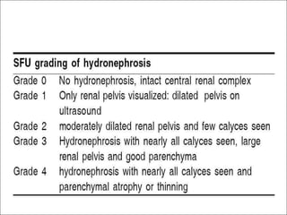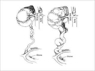 Hydronephrosis is dilatation of the kidney caused by urine outflow obstruction anywhere along the urinary tract. It can be caused by extramural factors like tumors or retroperitoneal fibrosis, or intramural factors like congenital abnormalities or inflammatory strictures. Bilateral hydronephrosis is commonly due to urethral obstruction from conditions like benign prostatic enlargement. Clinical features depend on severity and location of obstruction, and may include flank pain, urinary symptoms, or renal failure. Diagnosis involves imaging tests like ultrasound and IVU. Treatment involves relieving obstruction through stents, nephrostomy, or open surgery like pyeloplasty depending on severity and cause of obstruction.