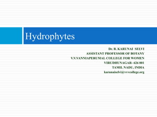 This document classifies and describes different types of hydrophytes: