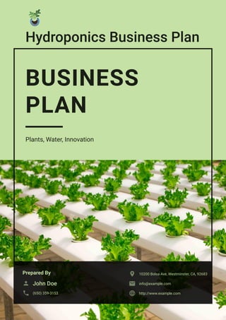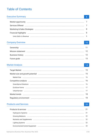 The document outlines a comprehensive business plan for a hydroponics venture, detailing sections such as executive summary, market analysis, services offered, and financial highlights. Key components include identifying the target market, discussing unique selling propositions, and presenting financial forecasts. The plan emphasizes sustainable practices and innovative solutions in hydroponic agriculture, aimed at attracting investors and guiding the operational process.