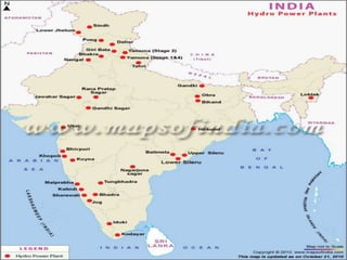 The document discusses hydropower, which is a renewable energy source that harnesses the kinetic energy of moving water. Hydropower has been used for thousands of years to grind grain and generate electricity. Modern hydropower plants capture the potential energy of dammed water and convert it to electrical energy using turbines connected to generators. The amount of power generated depends on the height that water falls and the volume of water flow. Larger dams and rivers with greater water flow can produce more hydropower.