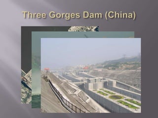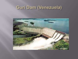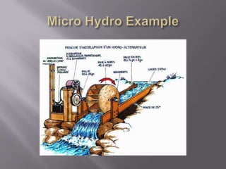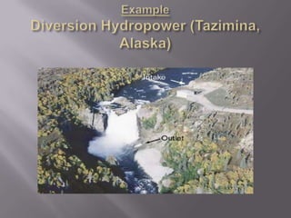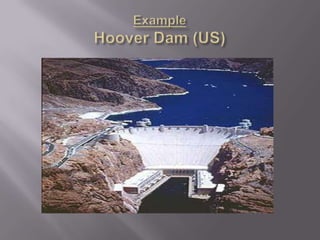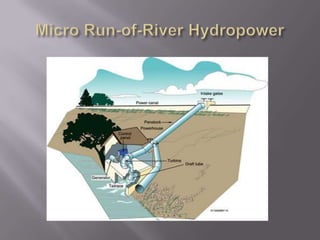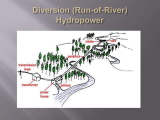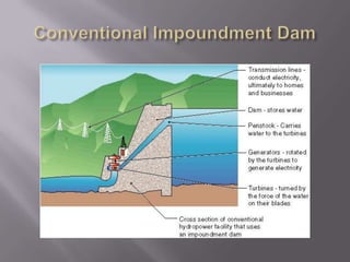 This document provides an overview of hydropower as a renewable energy source. It discusses different types of hydropower technologies including large hydroelectric dams, medium and small hydro, mini hydro, micro hydro, and pico hydro. It also discusses key design aspects of hydropower including head, dams, and the relationship between power output and head and flow. Examples of some of the largest hydroelectric power plants in the world are listed along with their location, year of operation, maximum generation capacity and annual production. The document emphasizes that hydropower is a modern technology that can be improved to make better use of available water resources.