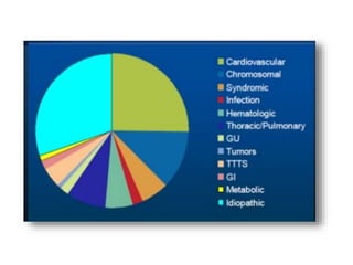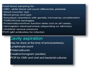 Hydrops fetalis, or fetal hydrops, is an abnormal accumulation of fluid in fetal compartments and body cavities. It is classified as immune or non-immune. Immune hydrops is caused by maternal-fetal blood group incompatibility while non-immune hydrops has various potential causes including genetic abnormalities, infections, heart defects, and tumors. Diagnosis involves ultrasound to detect fluid accumulation while treatment depends on the underlying etiology but may include fetal transfusions, medications, or early delivery. Prognosis varies significantly depending on the cause and gestational age at presentation and treatment.